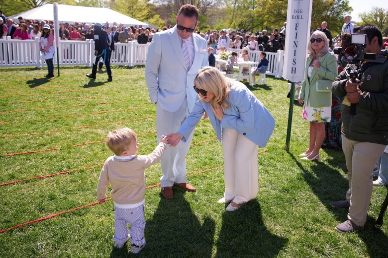 People have side-eyed Karoline Leavitt's marriage to Nicholas Riccio for a number of reasons. The two of them aren't often seen in public together, and when they are, there's often backlash online about the dramatic age gap between Leavitt and Riccio: 32 years. But in a "we don't really care what you think" moment to her critics, Leavitt brought Riccio with her to the White House Easter Egg Roll. Leavitt went with an oversized blue blazer, and Riccio was wearing a pale blue jacket with white pants. Their son was wearing blue and white pants. The coordinated outfits definitely show them as a united front who are going to live their lives how they want, no matter what anyone has to say.