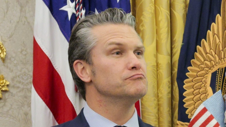 Iran isn't the only war Pete Hegseth is dealing with in 2026. The secretary of defense has also been in a battle with photographers that keep capturing less-than-dignified pics of him during his press briefings. Sources for the Washington Post claimed that after "unflattering" photos of Hegseth made the rounds following a March 2 briefing, the Pentagon went as far as to bar certain photographers from being in the room during Hegseth's next two press conferences. And while that may have helped for a brief time, by the end of the month, social media users had centered in on a new uncomplimentary snapshot of the former Fox News host.