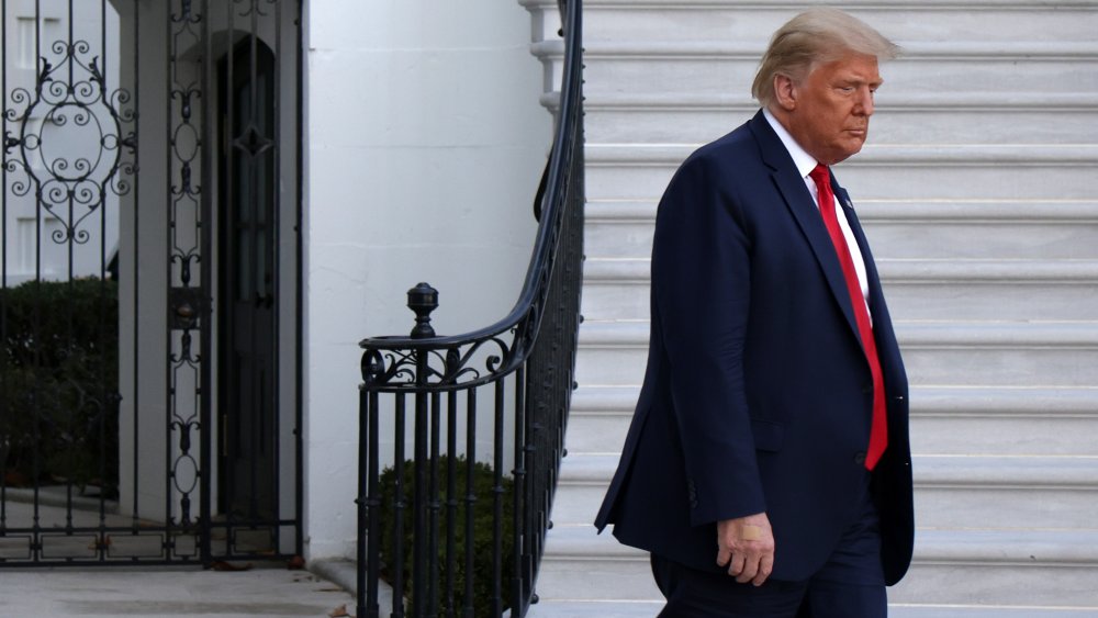 After returning to the White House, POTUS might have done well to stay put while he recovered from his serious illness, but instead he chose to double down on campaign appearances and rallies (although he took a pass on a virtual debate with Joe Biden). In a rally held by a mask-free Trump on October 12 in what he called his "home state" of Florida (via YouTube), he not only swore up and down he was COVID-free but offered to prove it by promising the entire audience, "I'll just give ya a big fat kiss." (No reports of any takers, to the CDC's great relief.) Still, there have been signs that all is not well with the president, at least if his voice is any indicator.