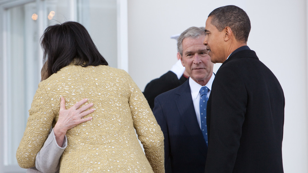 President Barack Obama's inauguration day gave onlookers an awkward Michelle Obama slip-up that was far more endearing than her Tiffany box incident at Donald Trump's inauguration, but nevertheless, Michelle did trip up just a tad when greeting President George Bush and First Lady Laura Bush. In a video captured by the Associated Press, Michelle can be seen reaching for President Bush's hand to shake, before then quickly realizing that she should have greeted the first lady. The quick little gaffe was a bit awkward but, if anything, very reflective of the nervous young couple that was about to occupy the White House.