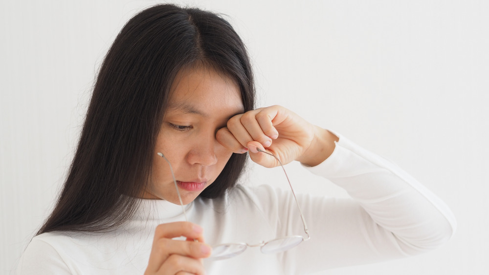While, per WebMD, most itchy eye issues are caused by allergies and can often be easily treated by avoiding triggers and using over-the-counter medications, eye irritation can also be a sign of a more serious problem like conjunctivitis, more commonly known as pinkeye. Pinkeye tends to be a lot grosser than your run-of-the-mill itchy eye as "pus might make your eyelids stick together while you're asleep" and there can also be "discharge."