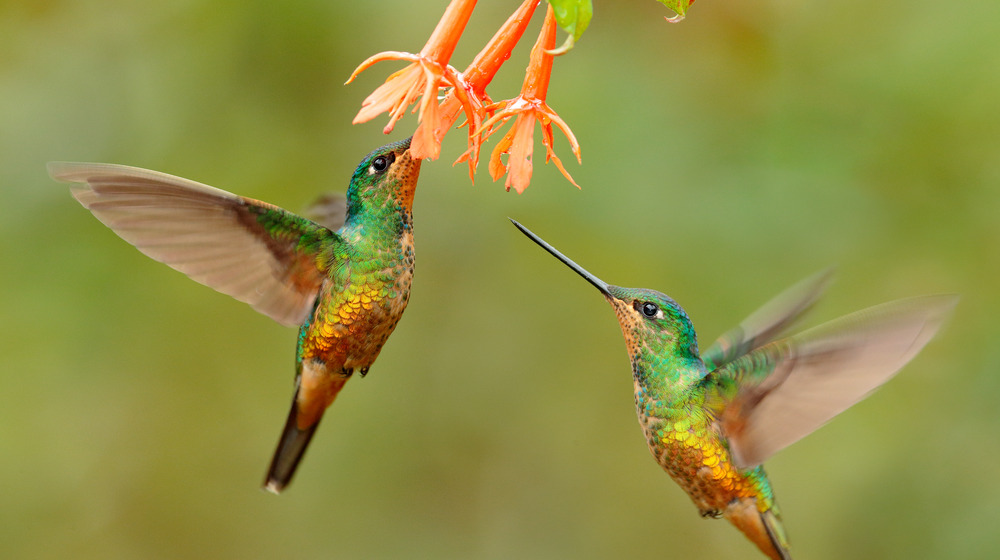 If you regularly plant a flower garden, you might occasionally receive some beautiful little visitors due to your healthy habit. Hummingbirds, the smallest migrating bird, have no sense of smell, so they rely on their color vision to find a food source. These tiny birds are the only ones that can fly backward, and their wings make a humming noise as they fly. In North and South America, 330 varieties of hummingbirds exist, and they're hungry, sometimes consuming double their body weight, which is as heavy as a nickel, in a day (via Kaytee).
