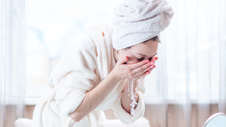 While it can be tempting to use homemade face creams and skin treatments, these products are not always safe. Essential oils, for instance, may have estrogen-like effects, as noted by Harvard Medical School. Baking soda, a common ingredient in homemade scrubs, can irritate the skin and remove its protective oil barrier, via Healthline. Instead, use plain water and a gentle face wash with basic ingredients.