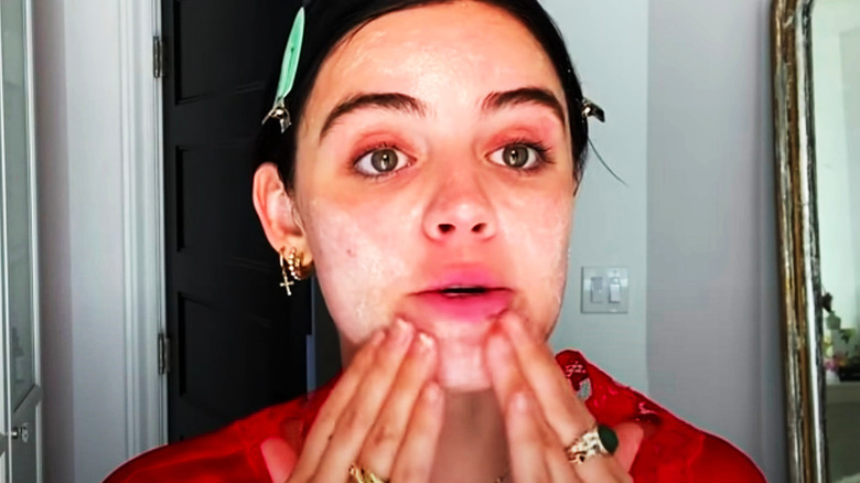 Lucy Hale is a self-proclaimed "big masker," so after using her LED face ware, she opted for a more traditional topical mask with ISUN's Skincare Rhassoul-Neem Face & Spot Mask. In order to purify the skin, Hale applied "a really thin layer ... focusing on the spots where I get clogged." After letting the clay-based mask sit for 15 to 30 minutes (via ISUN), Hale rinsed of the soothing herbs and moved on to mask number three.