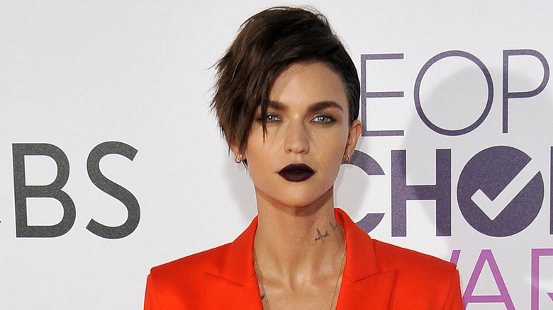 Talk about making a statement! Ruby Rose appeared at the 2017 People's Choice Awards (via Just Jared) with an iconic bright orange suit and deep dark lipstick and eyeshadow looking absolutely iconic. Her long 'do is heavily parted to the side, framing her face and accentuating her jawline so well.