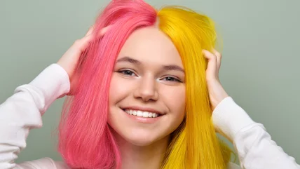 Another style of color blocking that we saw all over in 2021 was this split-dye look. It's a bold, contrasting look you can use with a variety of color combos. Some people bleached one-half of their hair while leaving the other natural. Another option is using a fashion color like pink, orange, green, or any other fun color along with your natural color or a bleached half. And some people even used two bright fashion colors with one on each side. With so many options, selecting two colors that go well together can be difficult. The Salon Success Academy offered some advice for picking two colors that go well together. They recommended combining light pastel colors and complementary colors or contrasting with blond and black.