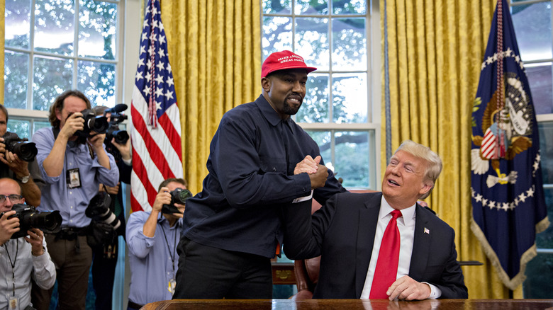 To say that many of us were shocked when Kanye West began to express his political affiliations is an understatement. Things started off on a really strange note in 2018 when he said that 400+ years of slavery was a "choice," and his comments just escalated from there (per CNN). As noted by USA Today, West expressed his support for then-President Donald Trump, and not only did West meet him at the White House, but he called the former reality television star his "brother." "You don't have to agree with trump but the mob can't make me not love him," West later posted on Twitter of his affiliation with the then-president.