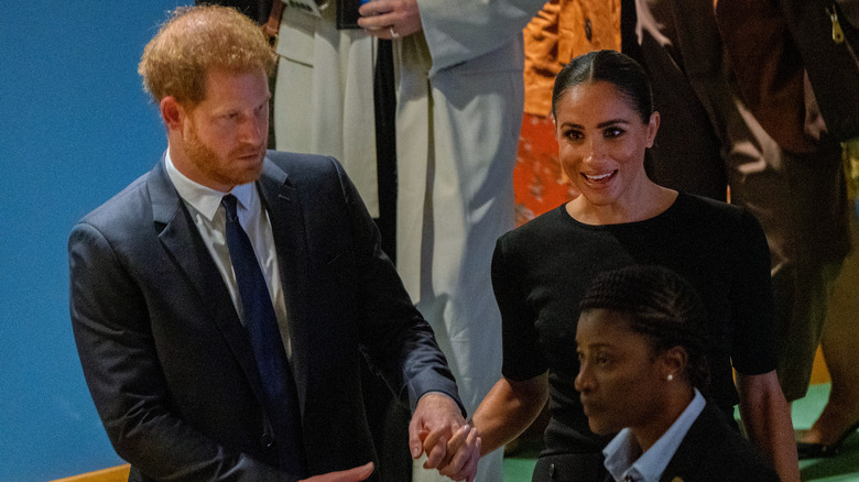 The List spoke to Mark Bowden, a renowned body language expert and author who offers coaching on communication skills through his company, TRUTHPLANE. Reflecting on the much-discussed U.N. moment between Prince Harry and Meghan Markle, he offered insight on what their actions said about the couple. "The interaction begins before this Twitter edit with both relaxed and talking with each other and smiling as a member of the public photographs them," he says. "Meghan takes Harry's hand, and he looks away to shade his expression from her."