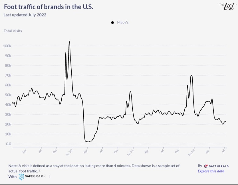 Determined to get to the bottom of it, The List created a graph using Data Herald that tracked foot traffic patterns at Macy's over the past two and a half years. The data shows that Macy's might be in serious trouble.