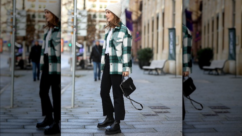 For an updated take on a classic look, a red flannel shirt will always look good paired with white boots and a cool beanie (via Byrdie). Pair your flannel with either black cargos for a throwback look or some straight leg jeans for a more modern one. You can also style a flannel as a dress for a fun night out and pair it with over-the-knee boots and some bike shorts underneath for extra coverage (per Seventeen).