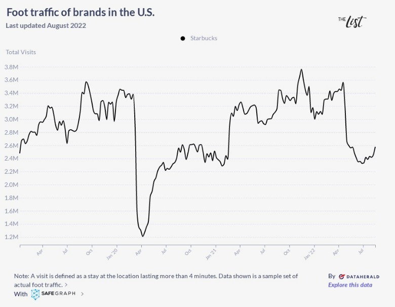 The List created a graph via Safe Graph to chart out foot traffic data of U.S.-based Starbucks stores, and it turns out there is one particular month that consistently sees higher-than-usual customer turnout.