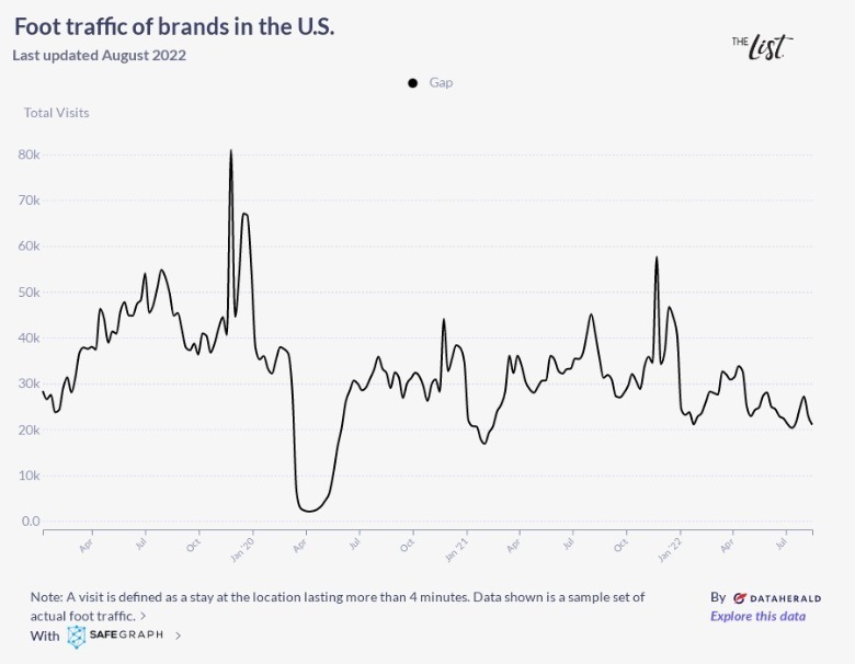 The List created a graph via Data Herald that tracked the foot traffic trends inside Gap stores over the past two years. The results show that the popular clothing retailer is missing shoppers more than ever, as they try to navigate post-COVID safety regulations, inflation, and changing shopper trends.